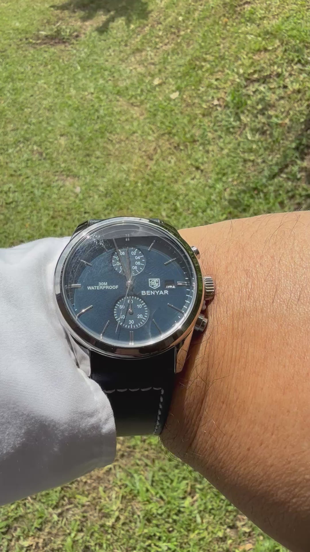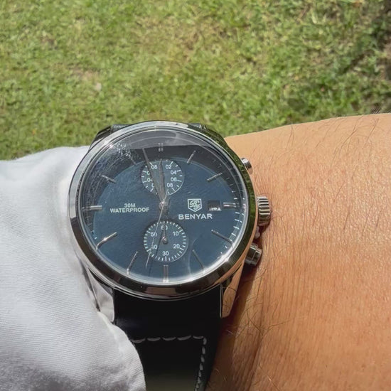 El Benyar 5213 es un reloj masculino que combina estilo deportivo con funcionalidad completa. Equipado con movimiento de cuarzo japonés, este modelo incluye cronógrafo activo, calendario completo, manecillas luminosas y caja de aleación resistente. Su correa de cuero genuino ofrece comodidad y durabilidad, ideal para el uso diario o eventos casuales. Con resistencia al agua de 30 metros (3ATM), es una excelente opción para quienes buscan un reloj elegante y accesible.