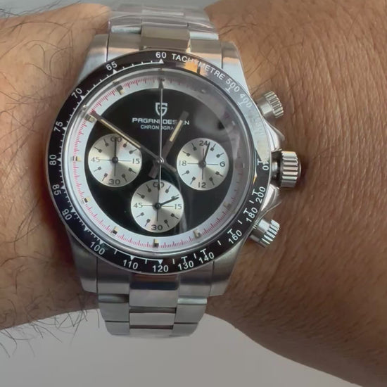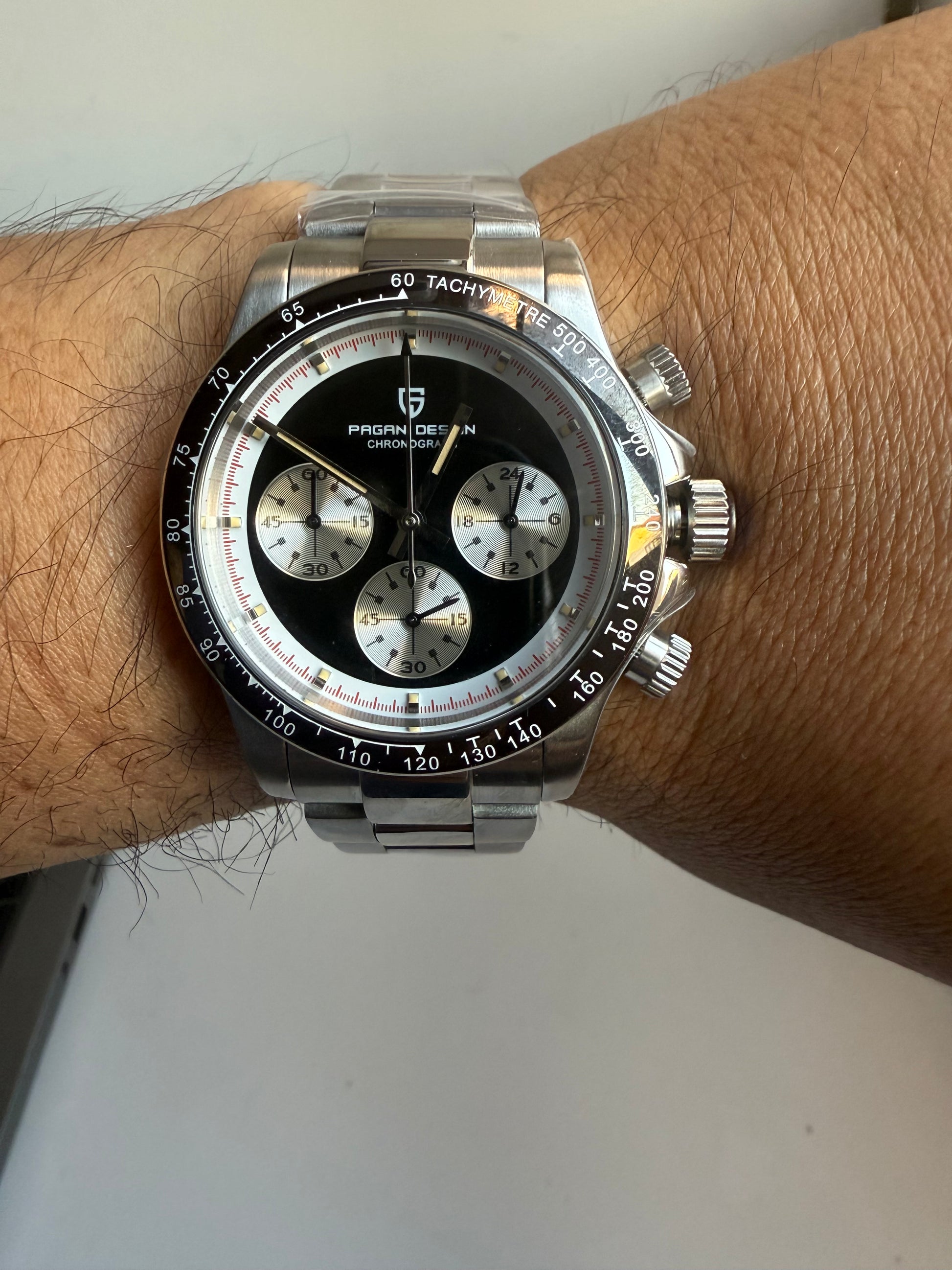 Sobria, elegante y versátil. La esfera negra del Pagani Design 1676 es ideal para quienes prefieren un look clásico y atemporal, perfecto tanto para el uso diario como para ocasiones más formales.